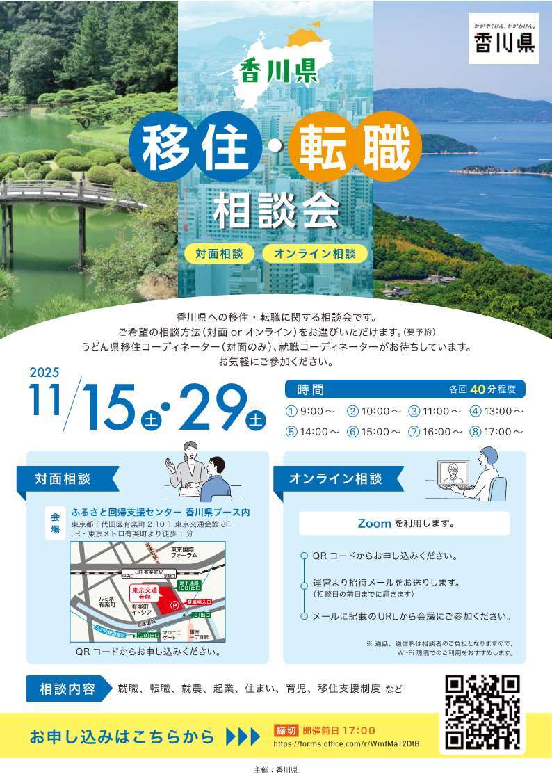 うどん県移住コーディネーター(対面のみ)、就職コーディネーターがお待ちしています。