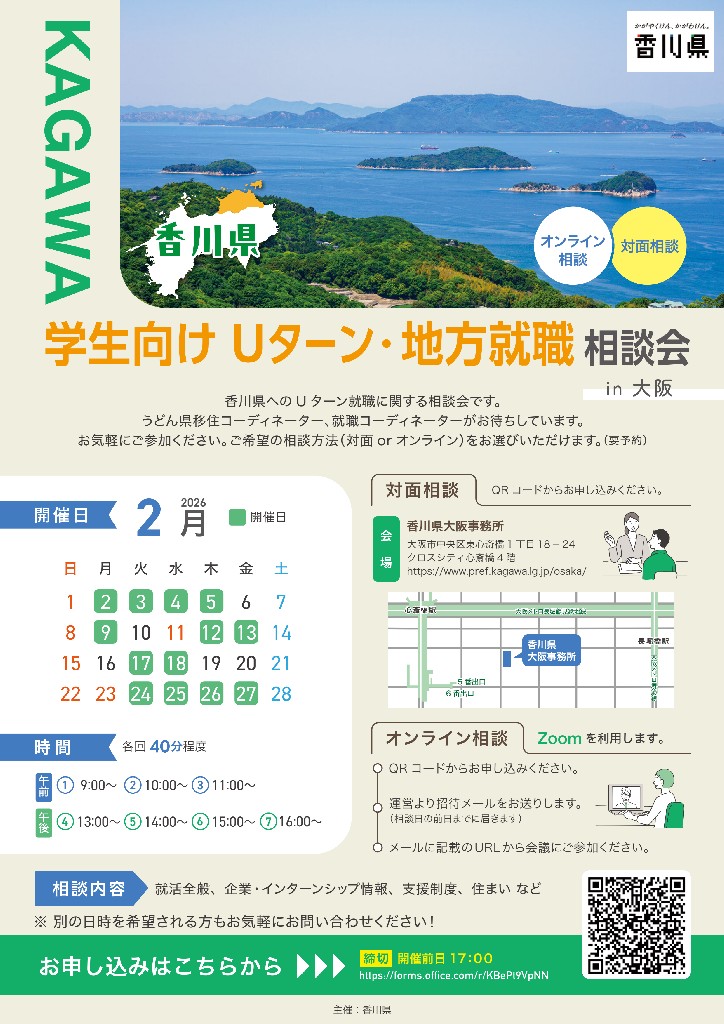 大阪(オンライン対応可)で開催される香川県へのUターン就職相談会です。